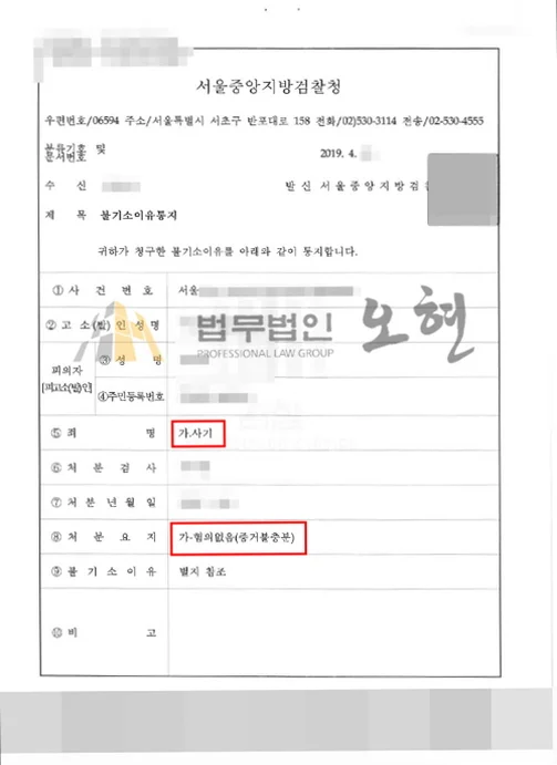 사건을 담당한 검사는 오현 변호인단이 제출한 방대한 양의 증거자료와 변호인 의견서를 면밀히 검토한 끝에, 회사의 고소 내용을 모두 배척하였습니다. 검사는 불기소 결정문을 통해 "의뢰인이 회사에 전문자격증이 있다고 적극적으로 기망하였다고 볼 객관적 증거가 부족하며, 회사가 해당 자격증을 필수 요건으로 하여 의뢰인을 채용하였다거나 의뢰인이 자격증과 관련된 업무를 수행하였다고 볼 만한 근거도 전혀 없다. 다수 임원진의 진술만으로는 사기죄의 혐의를 입증하기에 턱없이 부족하다"고 명시하며, 가장 완벽한 승리인 '혐의없음(불기소 처분)'을 내렸습니다.